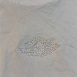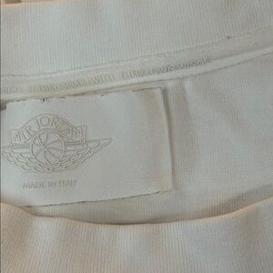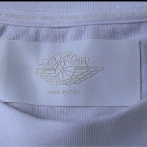Made in Italy Elevate your casual wardrobe with this classic white men's t-shirt. Perfect for any occasion, it offers comfort and style. Heavy weight , Made in Italy Air Jordan White T shirt! Hard to find has gold accent on bottom of shirt as pictured!