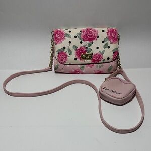 Betsey Johnson crossbody bag, Luv Betsey floral purse, pink rose print handbag, Betsey Johnson chain strap bag, Betsey Johnson heart pouch purse, floral crossbody purse women, Betsey Johnson rose handbag.
