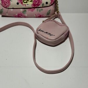 Chic and playful Luv Betsey by Betsey Johnson crossbody bag featuring a beautiful pink rose floral print with black polka dots. This stylish bag includes a gold chain strap and a matching heart-shaped pouch, making it both fashionable and functional.