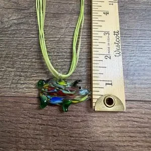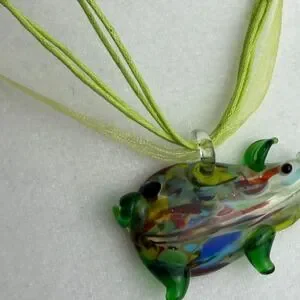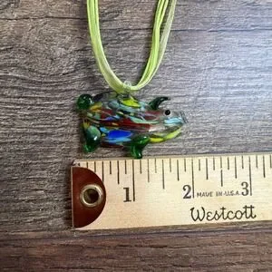 Art Glass Pig Pendant Necklace Lime Green Ribbon Cord Confetti Animal Jewelry