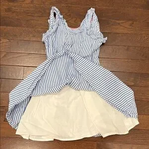 This adorable Crewcuts dress is perfect for your little girl's spring and summer wardrobe! It features a classic blue and white vertical stripe pattern and sweet ruffle details on the shoulder straps. It has a hint of coral/pink trim at the neckline and a flowing skirt with a white undershirt.