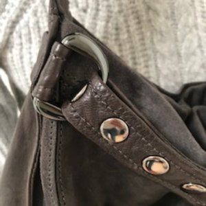Stylish Kooba two-tone hobo. Soft leather body with contrasting panels. Top strap with metal stud accents. Single shoulder strap for easy wear. Neutral tones pair with many outfits.