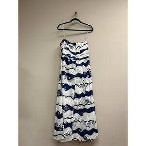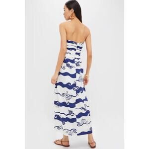 "The Painted Print Maxi Dress boasts a flattering strapless silhouette with a ruched bodice and ocean-inspired print. We are pairing this with sandals or heels for all of our events this season.