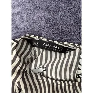 Playful Zara Basic Collection striped blouse featuring whimsical cat illustrations throughout the design. Lightweight and flowy with a flattering tie waist that creates a feminine silhouette.