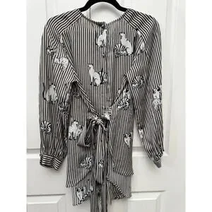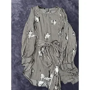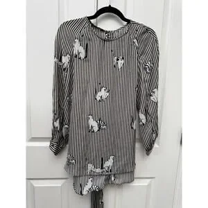 Zara Basic Cat Print Striped Blouse Tie Waist Long Sleeve Shirt Womens -Medium