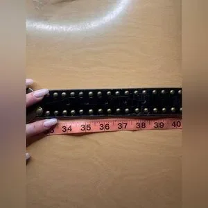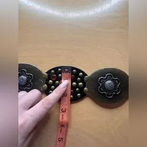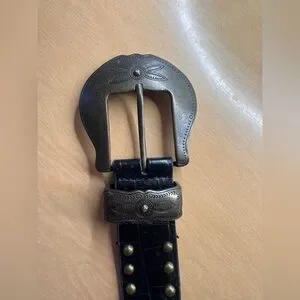 Early 2000s studded leather western belt with a great statement look. Black croc-embossed leather with alternating oval concho-style plates in antiqued brass and black enamel, detailed with mixed dome studs and warm amber rhinestones that catch the light. Finished with an oversized engraved western buckle with etched floral detail. Chunky Y2K belt with a little boho / festival energy that looks great worn at the waist over a dress or low on the hips with denim. western, studded, concho belt, festival vibes!!