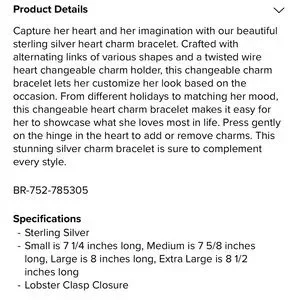 Elegant sterling silver heart charm bracelet perfect for any occasion. Add a touch of sophistication to your outfit. DOES NOT INCLUDE CHARMS. Does come with the original box and felt bag. Sizing info in last picture. This is a size LARGE.