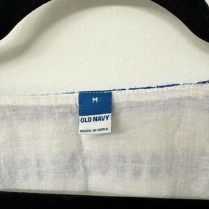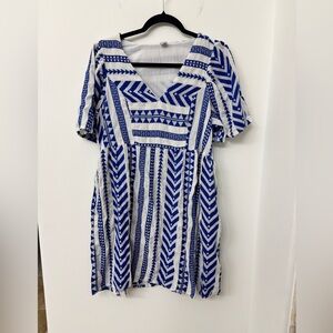 Old Navy Tribal Mini Dress. Size M | Medium. Features a bold blue and white color pattern, two pockets, short sleeves that are oversized, a flowy fit, and a v neckline.