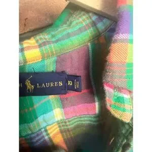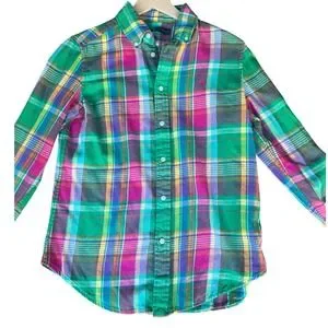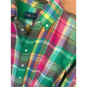 Ralph Lauren button-down shirt in a vibrant multi-color plaid pattern. Crafted from a soft, lightweight fabric, this long-sleeve top features a classic button-down collar and a curved hemline. A pink embroidered pony logo accents the chest, adding a signature touch to the bold green, pink, purple, and yellow check design. Perfect for layering or wearing on its own for a preppy, colorful look.