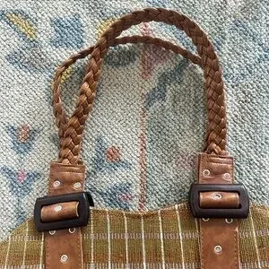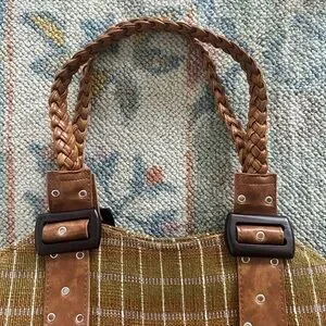 A stylish woven plaid shoulder bag in an autumnal/mustard color palette. Features braided pleather straps for a fun touch. Vintage OOAK piece. Unique shape. Style tags: Sezane, Free People, Anthropologie. Very similar to a Harris Tweed tote.