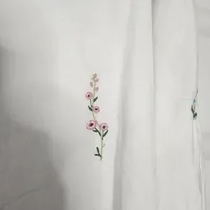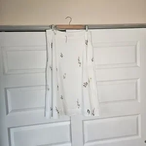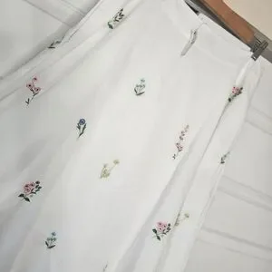 Crisp white midi skirt with scattered small floral motifs. Lightweight and flowy silhouette. Easy to style with casual tops or jackets. Subtle colorful embroidery adds charm.