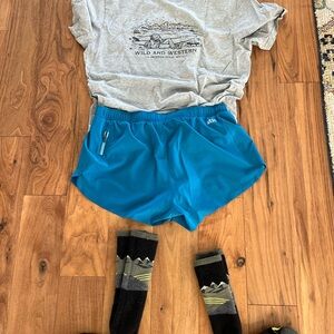 Stylish teal shorts and light gray t shirt top from Stio. Ideal for active wear. Wool socks for another season, two pairs