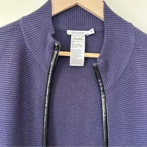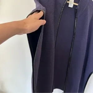 Chico's open-front knit poncho in rich navy. Subtle ribbed texture for added interest. Black trim accents the front and sleeve openings. Easy drape for layering over tops. Versatile piece for casual or dressier outfits.