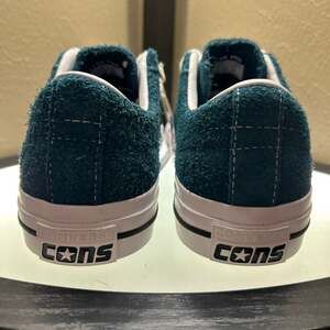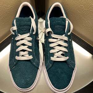 Converse CONS One Star Pro Ox in Midnight Turquoise, Size 9.5 — Brand New with Tags. These skate-ready low-top sneakers feature a premium hairy vintage suede upper in a deep teal hue. Designed for performance and durability, they include a CX foam sockliner for impact protection and a rubber-backed upper. The classic white star cutout and gum rubber outsole provide a timeless aesthetic. Includes white laces with CONS branding on the aglets. Unworn and in pristine condition.