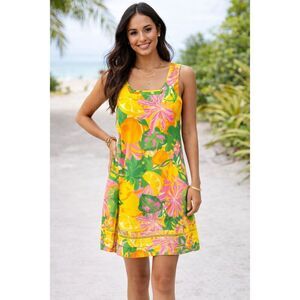 Bright, breezy, and effortlessly chic, this C&C California linen dress is perfect for warm-weather days. Crafted from breathable linen, it features a vibrant tropical citrus and floral print with bold shades of yellow, pink, green, and orange. The sleeveless design with a square neckline and relaxed shift silhouette offers comfort and easy movement, while the decorative hem detail adds a polished touch. Ideal for beach vacations, resort wear, summer outings, brunch, or casual coastal days. Lightweight, colorful, and timelessly summery.