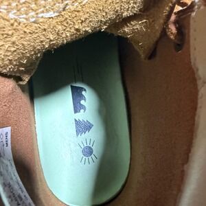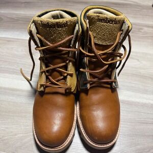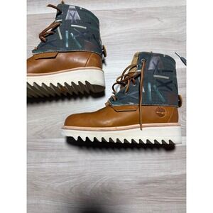 Timberland Heritage 6-Inch boots feature a unique asymmetric design with premium leather uppers and a bold shark-tooth ripple sole. The left boot showcases a tan suede collar with debossed branding, while the right boot features a dark patterned textile collar for a striking mismatched look. Built with a durable Goodyear welt construction and a white platform midsole, these boots offer a modern twist on a classic silhouette. These boots are in excellent pre-owned condition with minimal signs of wear. Suitable for streetwear fashion, outdoor excursions, or casual urban outings.