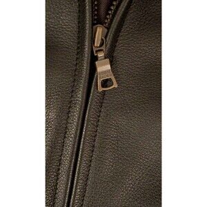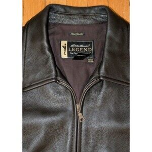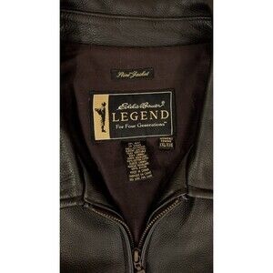 Classic brown 100% genuine leather jacket from Eddie Bauer's premium Legend collection. This is a timeless piece from their heritage line, designed to last for generations. The Stine model features a refined, versatile silhouette that works for both casual and dressy occasions. Pebbled leather - soft, supple texture. Body lining is 100% cotton, sleeve liking is 100% nylon. Full-zip front closure with metal zipper. Two front pockets, one inside zip closure left chest pocket. Adjustable back waist straps with buckles for custom fit. Point collar (not moto-style) - clean, classic look. Fully lined. Eddie Bauer Legend Collection Premium quality construction.