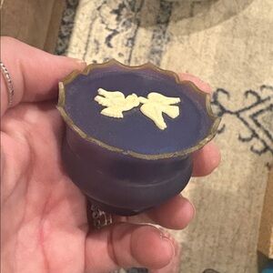Vintage Avon Rapture cream sachet jar, featuring a dark purple glass pedestal container and a plastic lid decorated with two white doves.