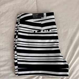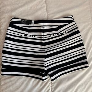 These mid rise shorts from Apt. 9 feature a bold black and white striped pattern, offering a chic and tailored look. The structured fabric and minimalist design make them a standout piece for any occasion. Waist measures approximately 17 inches and inseam measures approximately 5 inches, Size 8 New With Tags