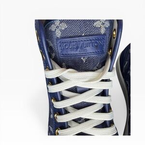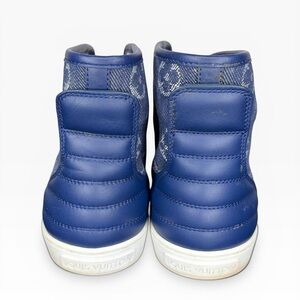 Navy high-top sneakers with white monogram pattern. Features white laces and toe cap. Iconic Louis Vuitton style.