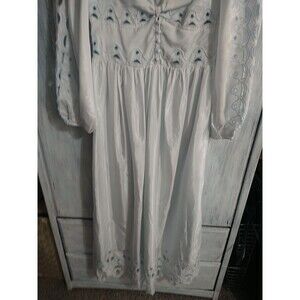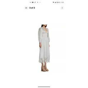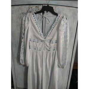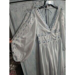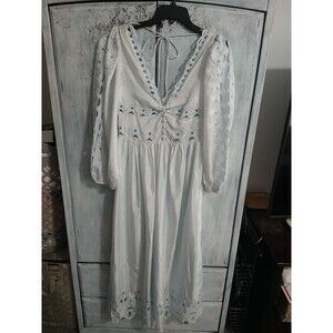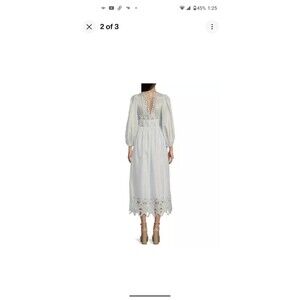 Elegant maxi dress with eyelet details. Features long sleeves and a deep V-neckline. Perfect for any occasion.