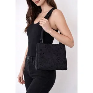 Vintage look black flocked velvet floral shoulder handbag in excellent used condition. Features an elegant tonal floral pattern, structured silhouette, and adjustable shoulder strap. Perfect Y2K, coquette, goth, or minimalist aesthetic accessory for everyday or evening wear.