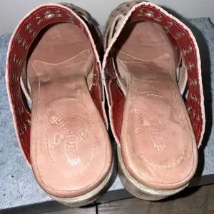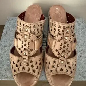 Elegant pink sandals with intricate cut-out pattern. Perfect for any occasion.