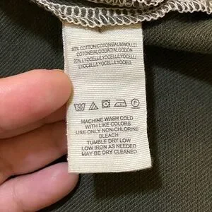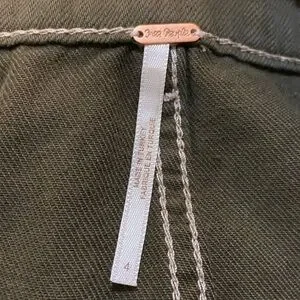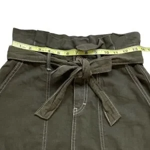 Olive army green color. Big utility cargo slant pockets on front, patch pockets at back. Woven cotton non-stretch twill fabric. High-waist silhouette, adjustable waist belt, ruffle waistband, button closure and zip fly. Effortlessly chic.