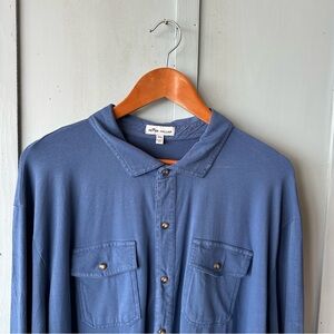 Stylish blue shirt with button-down design. Features dual chest pockets. Ideal for casual outings.