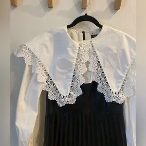 Chic formal dress by River Island. Features a striking black and white design. Elegant lace accents and pleated skirt. Ideal for special occasions.