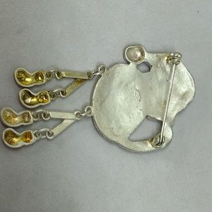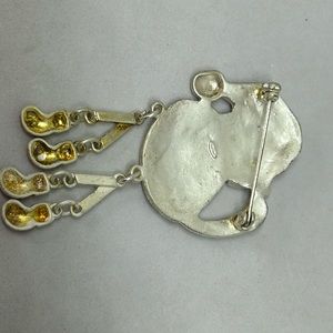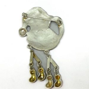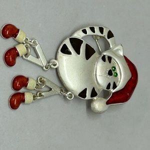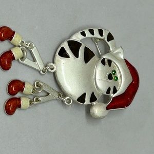 Christmas Cat with Dangle Legs & Red Cap Brooch Pin. Legs dangle and move. Made of metal, enameled, no markings. 3" long size. Pre-owned in good condition.