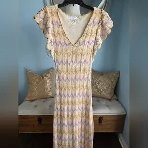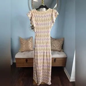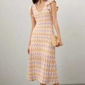 Scalloped stripes look extra retro chic in this crochet midi dress by Derek Lam Collective. Style the wavy flutter sleeves with a statement watch to balance the boho look.