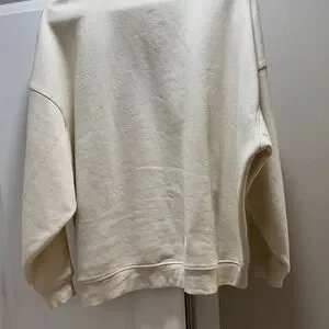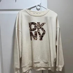 Chic DKNY sweater in cream. Features bold leopard print logo. Ideal for casual wear.