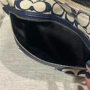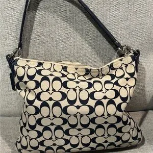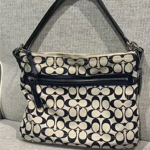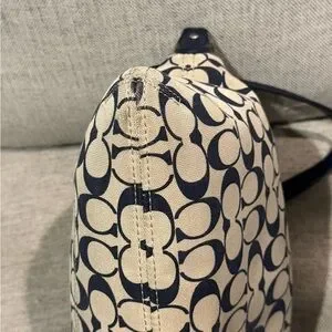 Coach shoulder bag with signature logo canvas. Navy leather trim and front zip pocket. Silver-tone hardware and top handle. Sleek everyday silhouette that pairs easily with outfits.