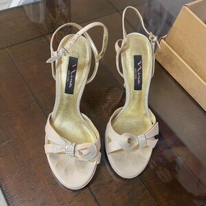 Chic Nina slingback heels in soft champagne satin. Decorative bow with rhinestone trim on the toe. Adjustable ankle strap for a secure fit. Sleek gold-tone insole adds subtle shine. Ideal for formal events and evenings out.