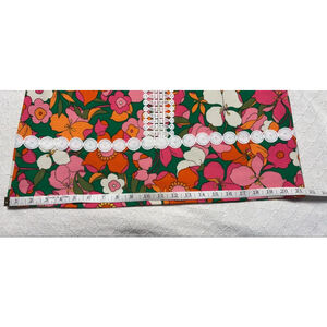 Design: Features a bold, multi-color retro floral print with white geometric lace trim along the neckline, center bodice, and hem.