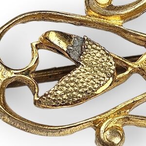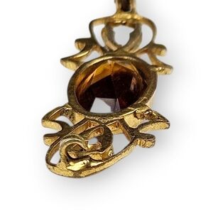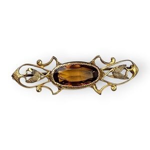 Delicate gold plated bar brooch featuring a faceted oval topaz colored glass gem in a collet setting, accented by ornate curving ends with tiny textured leaves