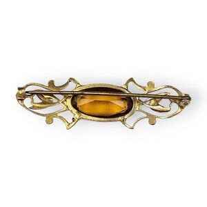Antique Art Nouveau Bar Brooch Topaz Glass Gem Floral Gold Plated 1910s Vtg FLAW