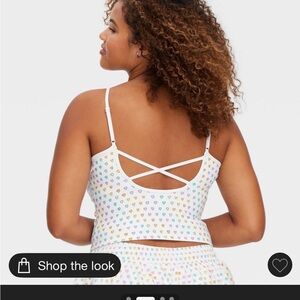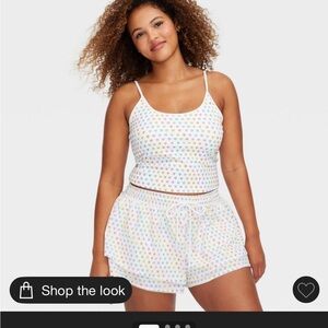 Soft white cami and matching shorts with all-over pastel heart print. Lightweight, breathable fabric. Drawstring waist on shorts for a relaxed fit.