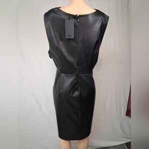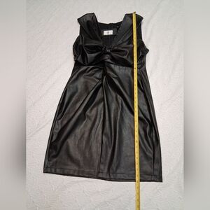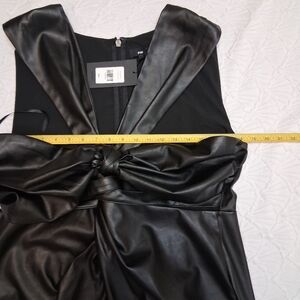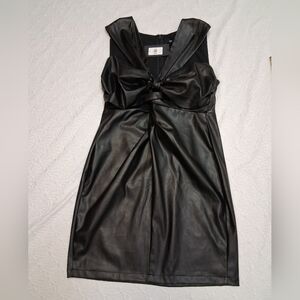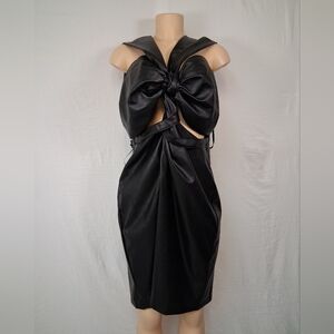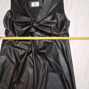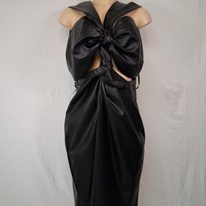 This dress is made of faux leather and features several distinctive design It is a black dress made from a faux leather material. It has a deep V-neckline, is sleeveless, and includes halter-style wide straps that create a large bow like or twisted detail at the center bust. The dress has a bodycon fit and a twist detail at the center. size 1 shell base:100% polyester shell coating:100%polyester lining:100%polyester made in china Perfect for upscale evenings and special events.