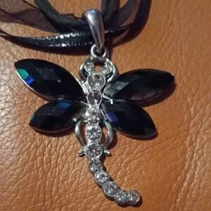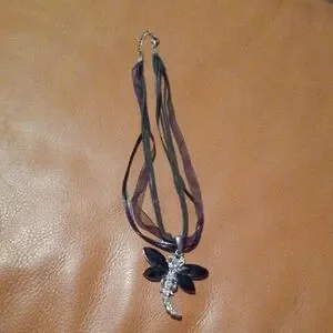 Stylish black dragonfly pendant on a layered ribbon necklace. Adds a unique touch to any outfit.