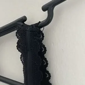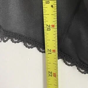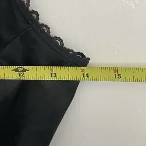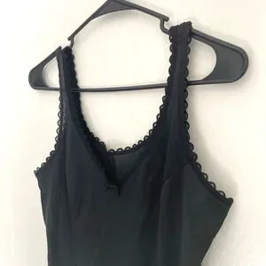 Vintage Y2K black nylon tank with delicate scalloped lace trim and a tiny bow detail at the bust. Semi-sheer and subtly flared for a flattering silhouette. Some loose threads on the straps (see photos), but no holes or stains. Tagged size 34, fits like a modern medium. Made in Costa Rica. Brand is Warners Perfect Measure.