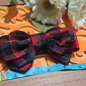 Red and dark green tartan with gold thread accents. Secured with a twisted gold cord center. Cute accessory for any dog or pet.