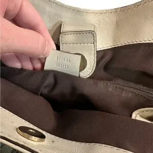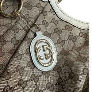 Signature GG canvas shoulder bag. Cream leather handles and trim. Gold-tone hardware and logo charm. Classic, polished silhouette. In great condition! A little dirty on the bottom as shown, overall would give it a score of about 95/100 for condition. A beautiful bag!! Authentic with serial number as shown. The exterior canvas is mostly clean. The leather trim has light rubbing and wear as shown. The hardware is bright and crisp and but shows some scuffing and scratches throughout. The interior lining is in good condition!