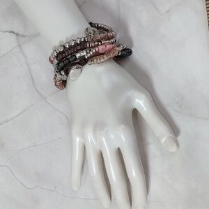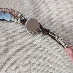 Sterling silver plated beads in assorted shapes and sizes accented with pink/blue/lavender gem and glass beads strung on brown leather cords.