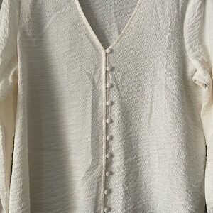 Chic cream blouse with a V-neckline. Features button-up front. Ideal for versatile styling.