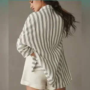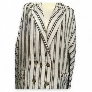 Anthropologie Pilcro double breasted cream and navy striped jacket. Features button front, Oversize fit, patch pockets, linen & viscose blend, and lined.