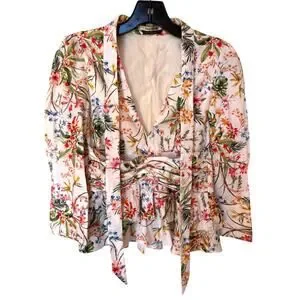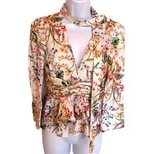 Hellessy Fitted Tie Front Floral Blouse with Ruffled Peplum Plunging V Neck s 2