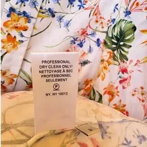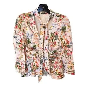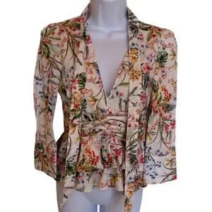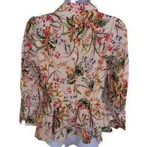Hellessy blouse in very good condition without significant wear. There are no stains, rips, or tears. This fitted blouse with a partial back zip has a number of distinctive features, including a neck tie, plunging v-neck, a layered, ruffled peplum, 3/4 length sleeves gathered at the shoulders, a cinched waist with gathered fabric in front, and silk lining. The outer shell is a sumptuous cotton with delicate floral print. Perfect blouse to wear to a wedding, or any event. Measures app'x: 16.5 pit to pit, 13.5 across waist, 21 long. The fabric has a little stretch.