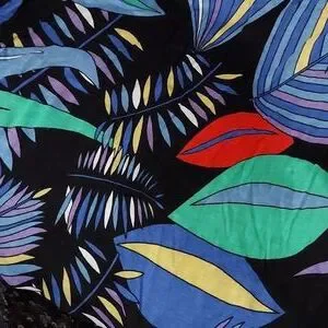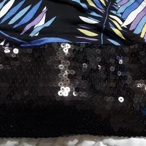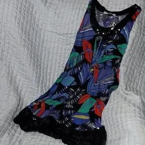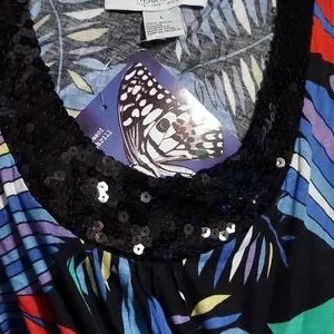 NWT Cruise Wear & Company Dress. Size: L, Color: Tropical Gemstone Colors of Red, Green, Purple, Yellow and Blue with Sequined Neckline and Hem. Approximate flat lay measurements: armpit to armpit 17.5 inches, back collar to hem 35.5 inches. NonSmoking home